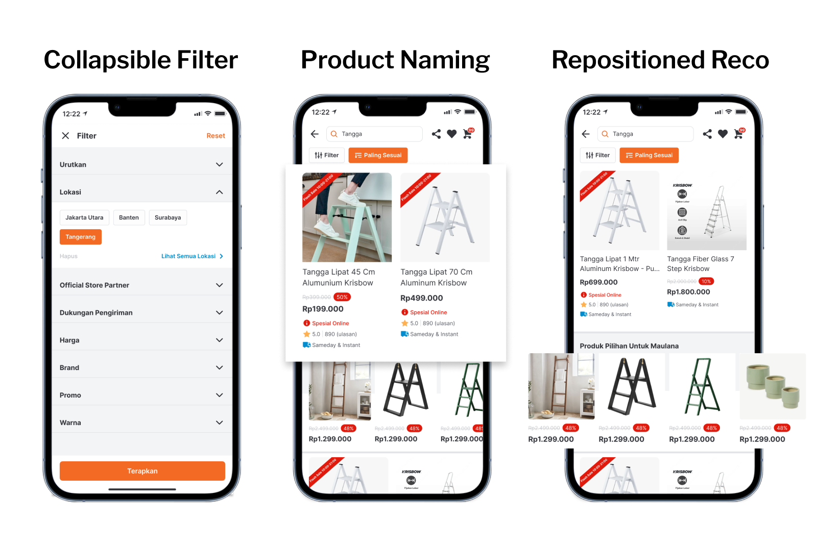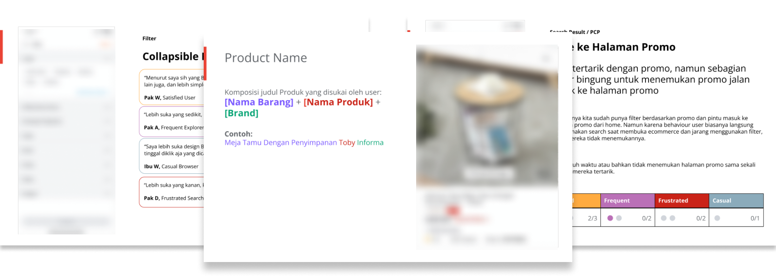 Our ideation session produced 14 potential solutions, narrowed down through a voting process to the top four: Collapsible Filter, Personalized Filter, Product Recommendation Position, and Detail Quick Look on Product Card. These prioritized ideas will undergo testing with customers to ensure alignment with their preferences and needs.