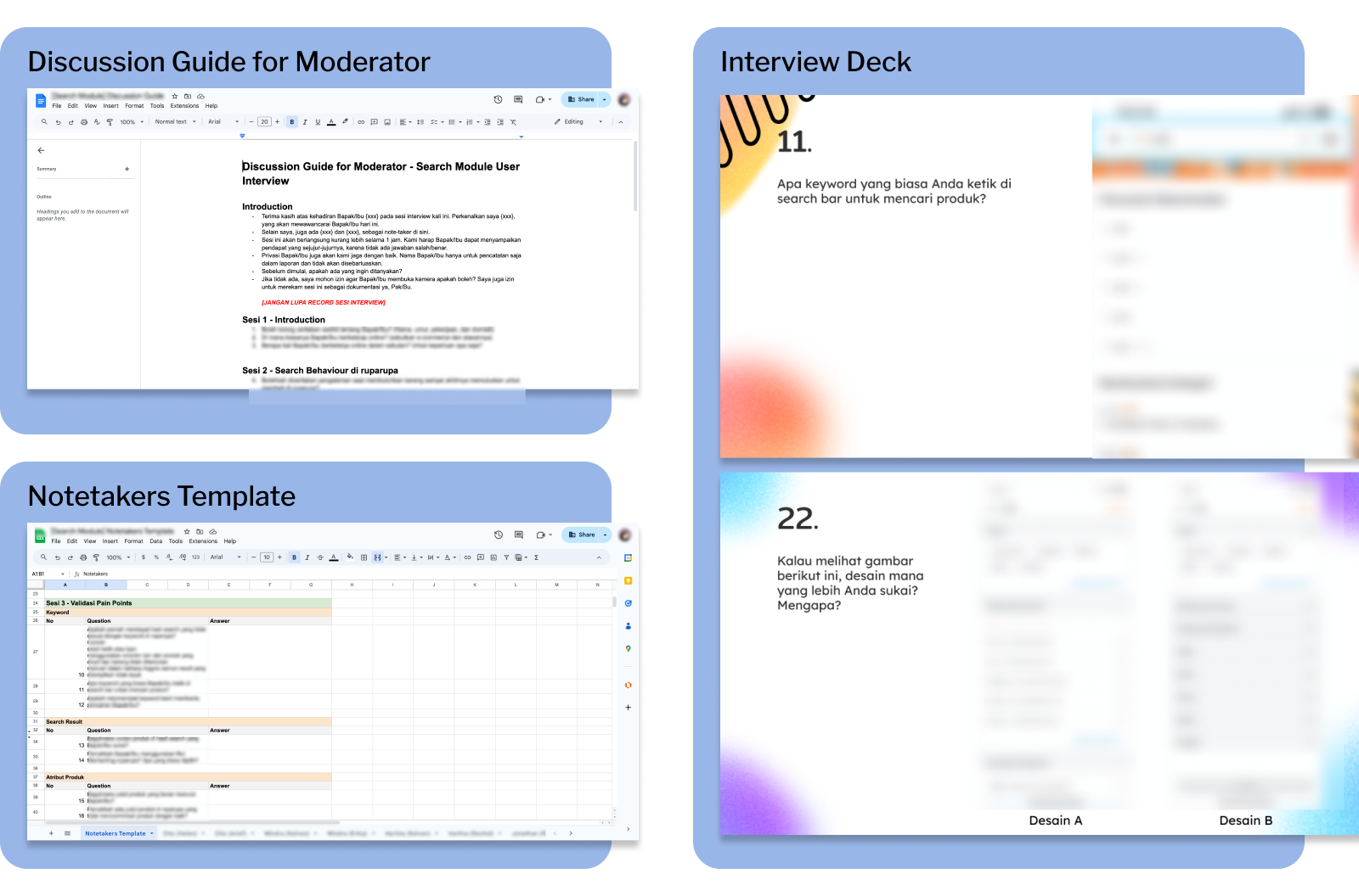 To ensure a structured and effective validation process, I prepared essential tools for the team, including a Notetakers Template, a comprehensive Discussion Guide, and an Interview Deck.