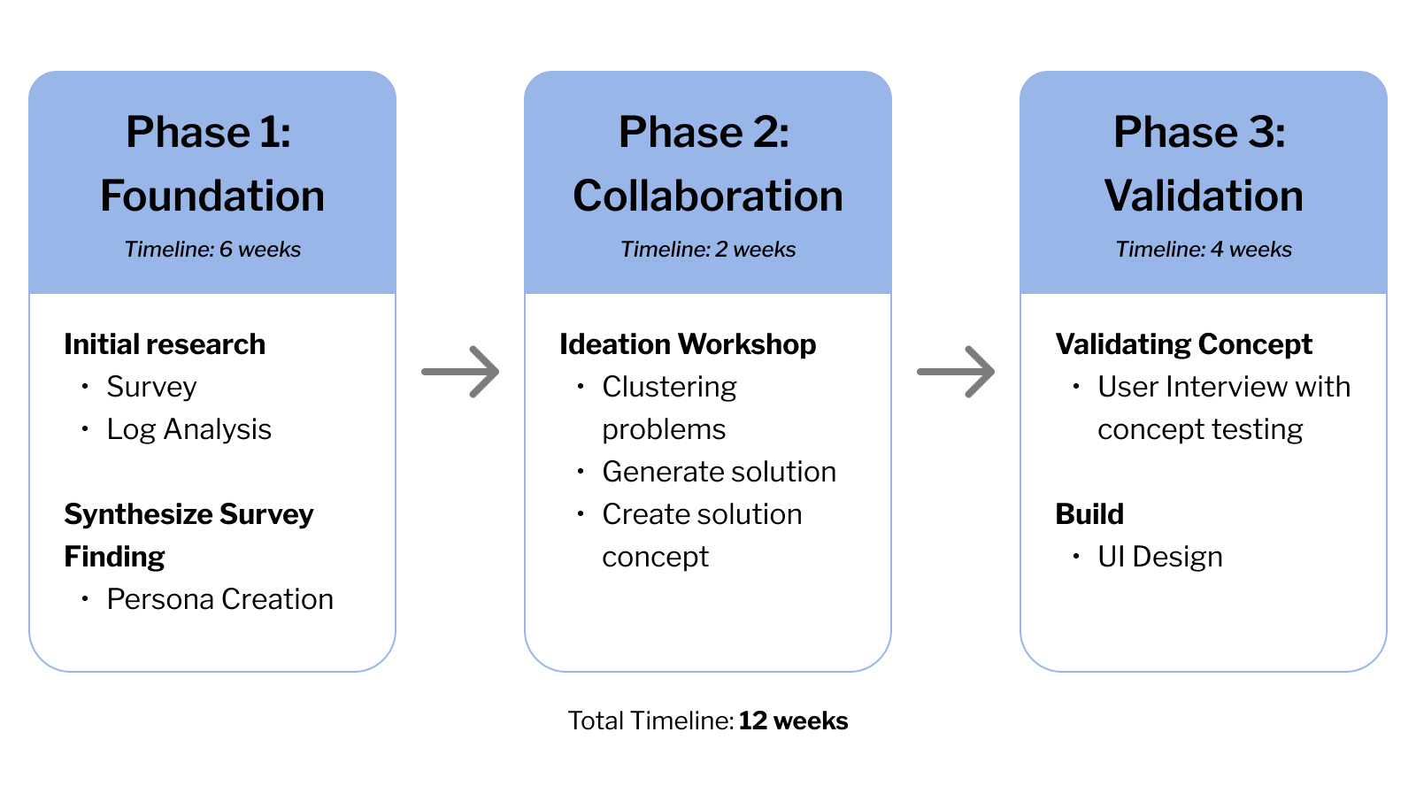 Aligned with our goals, I collaborated with the project manager to create a detailed plan. Acknowledging the research complexity, we divided it into three phases for a systematic exploration. This strategic approach ensures a comprehensive exploration to generate solutions meeting customer needs.