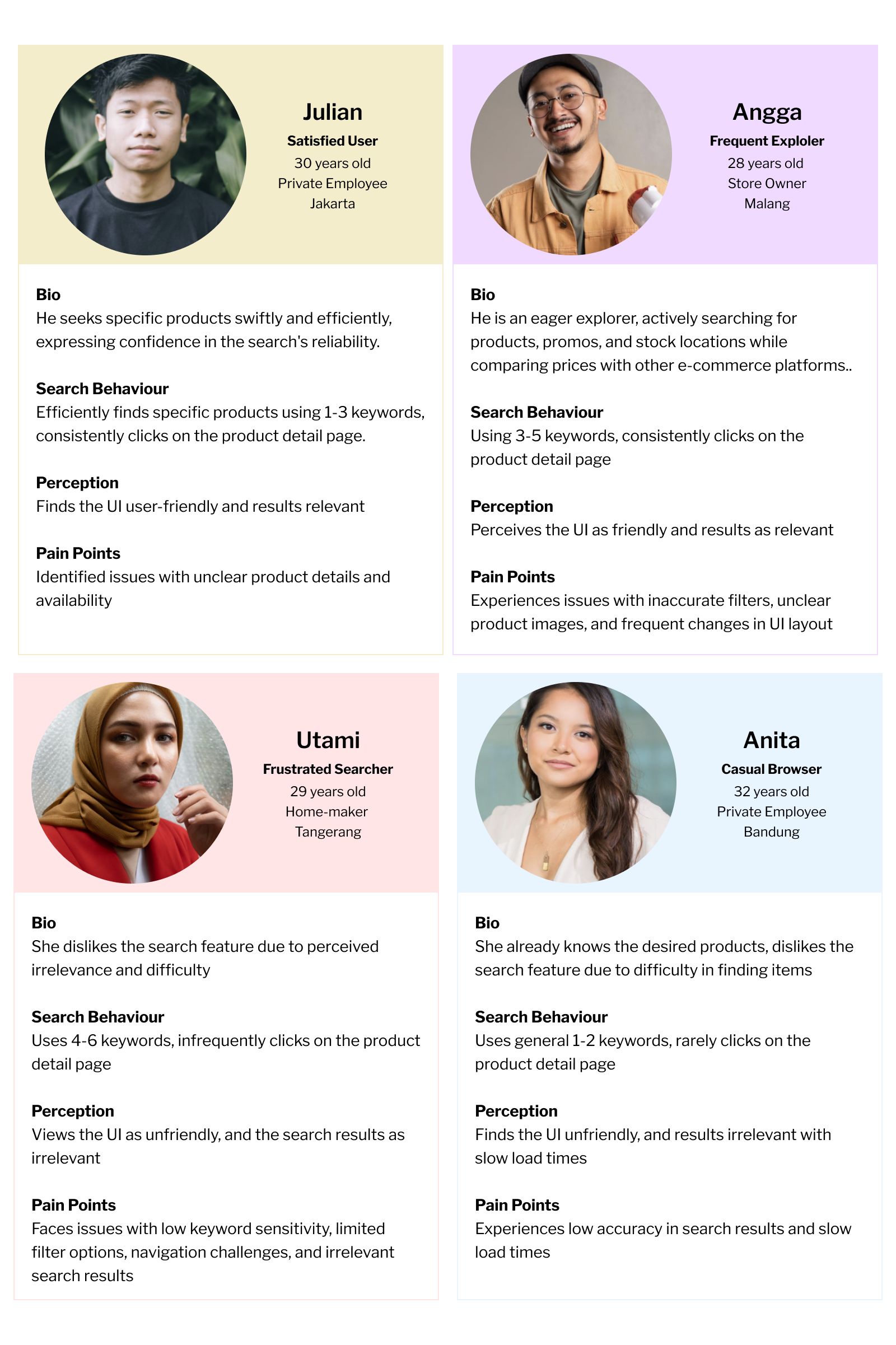 Building upon our survey findings, we were able to classify users relying on the search feature into four distinct personas.